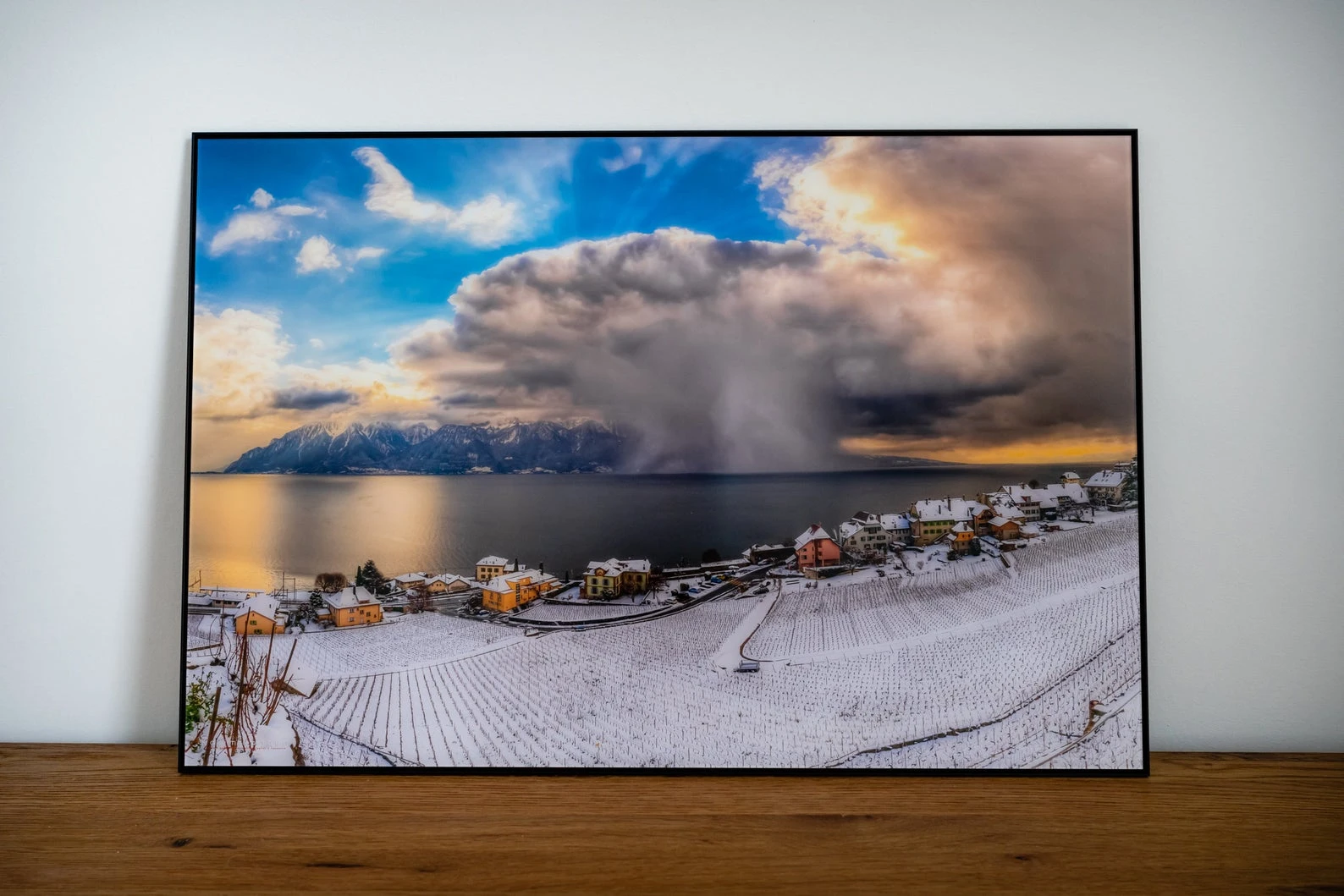Fuji Crystal Archive glossy original photo print, mounted under 2 mm matte acrylic glass on 3 mm Aluminum Dibond, in a 10 mm–deep black aluminum frame