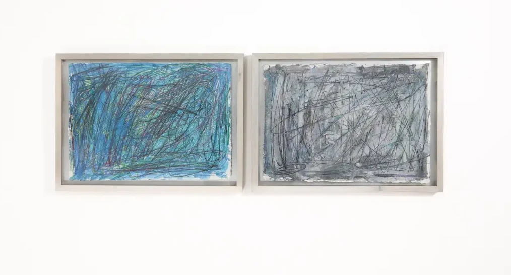 Gesso, pencil, and oil on cotton rag paper with artist frames