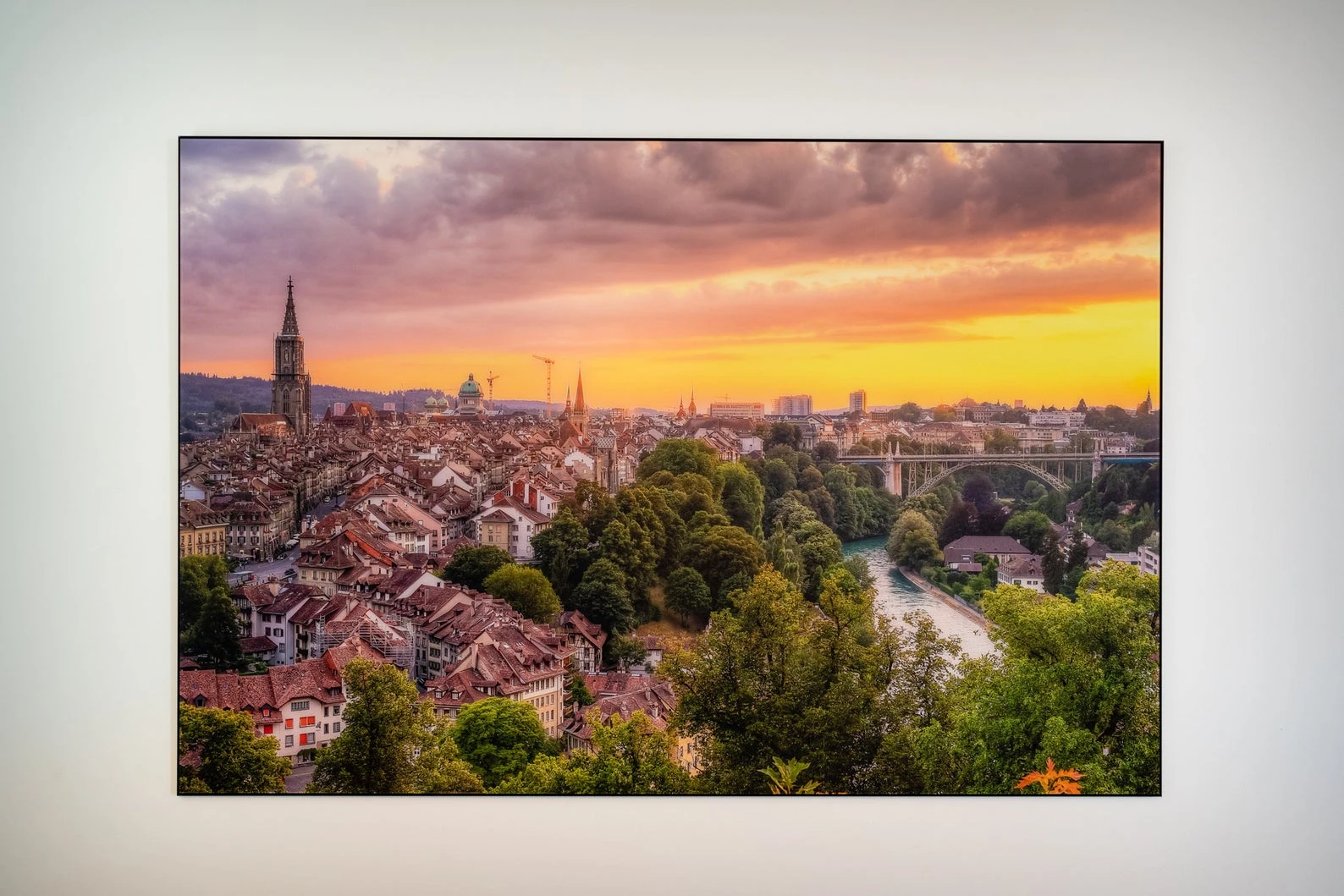 Fuji Crystal Archive glossy original photo print, mounted under 2 mm matte acrylic glass on 3 mm Aluminum Dibond, in a 10 mm–deep black aluminum frame