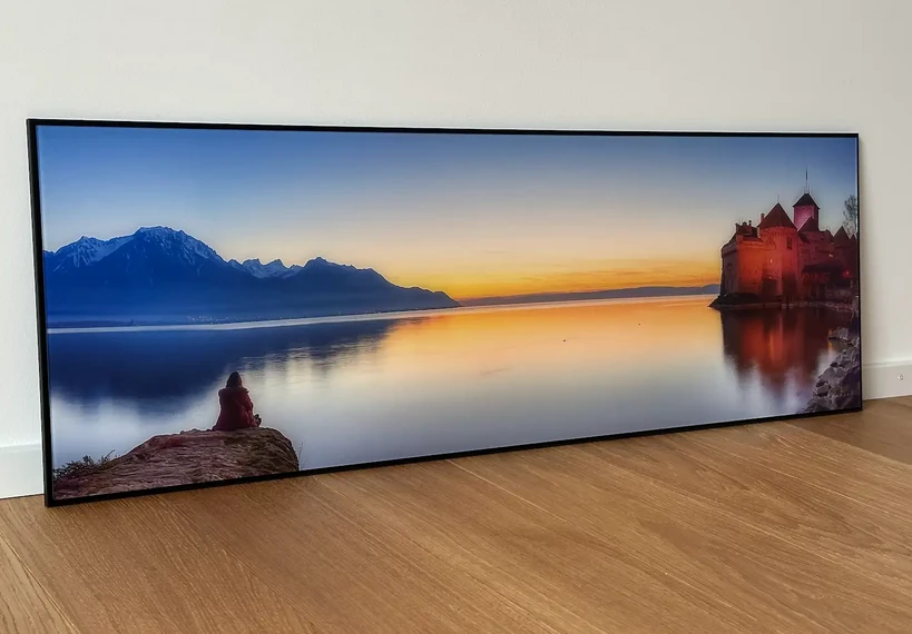 Fuji Crystal Archive glossy original photo print, mounted under 2 mm matte acrylic glass on 3 mm Aluminum Dibond, in a 10 mm–deep black aluminum frame