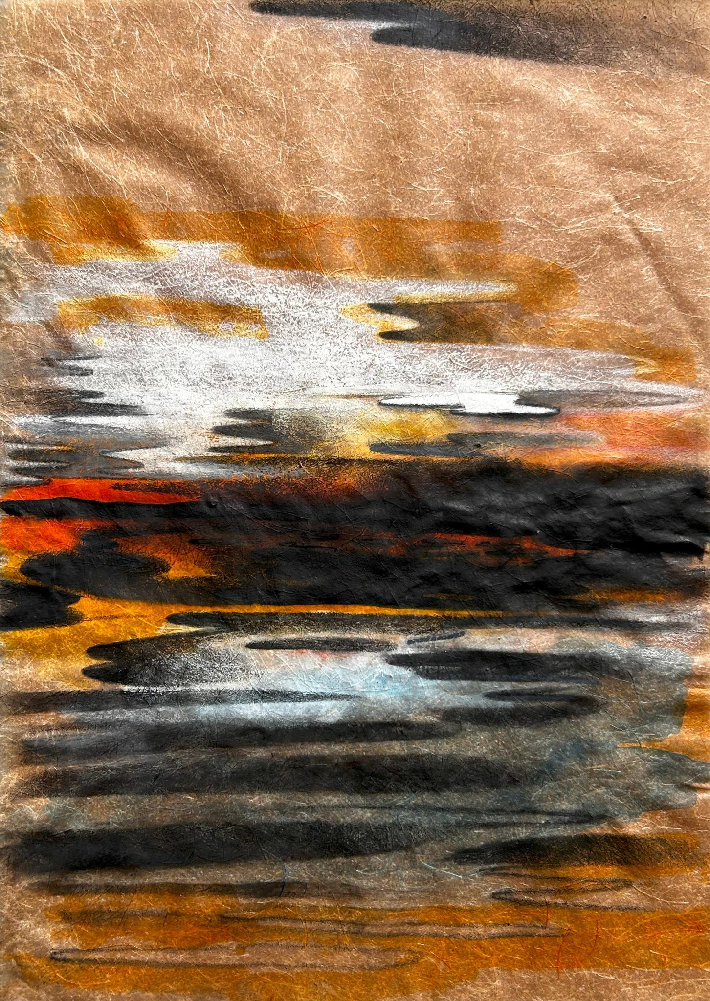 Mixed media, including colored pencils, ink, charcoal, and handmade paper from Peruvian Amazon fibers