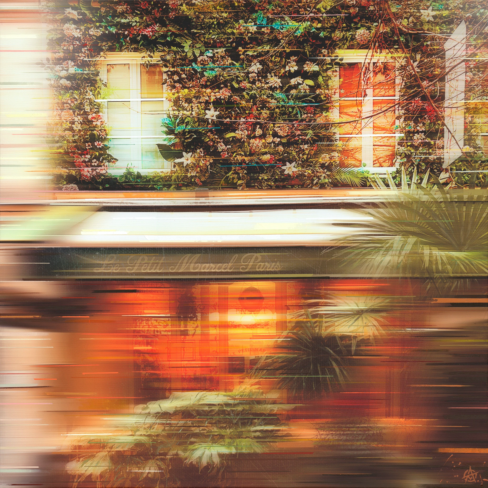 Original photography, giclée printed on to canvas then overlaid with acrylic and spray paints, screen printing, 22 carat gold leaf and copper leaf.